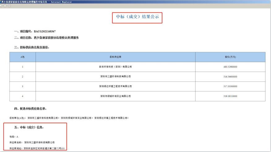 2021年4月29日,深圳公共資源交易中心發布中標公告:深圳市三盛環??萍加邢薰局袠宋鬣l街道家庭廚余垃圾收運處理服務。