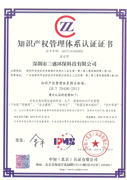 近日,深圳市三盛環保科技有限公司順利通過了《企業知識產權管理規范》國家標準審核認證,并收到由中知(北京)認證有限公司頒發的《知識產權管理體系認證證書》。在知識產權領域獲得新的認可,在知識產權方面得到進一步規范、有助于企業科學發展、提升企業科技含量,在綜合競爭力方面得到進一步提升!